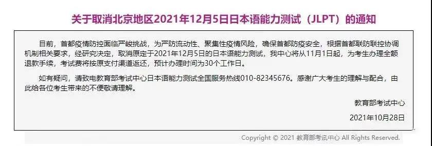目前,首都疫情防控面临严峻挑战,为严防流动性、聚集性疫情风险,确保首都防疫安全,根据首都联防联控协调机制相关要求,经研究决定,取消原定于2021年12月5日的日本语能力测试,我中心将从11月1日起,为考生办理全额退款手续,考试费将按原支付渠道返还,预计办理时间为30个工作日。